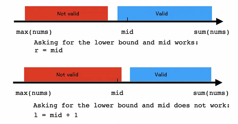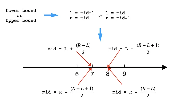 def binary_search_lower(nums, target, expect): while left < right: mid = left + (right - left) // 2 # lower bound, since mid=l+(r-l)/2, we must avoid l = mid (infinite loop, e.g. arr=[0,1] with target=0) if condition(mid): # if mid works right = mid else: left = mid + 1 # otherwise causes infinite loop return left # find left most index (left == right)