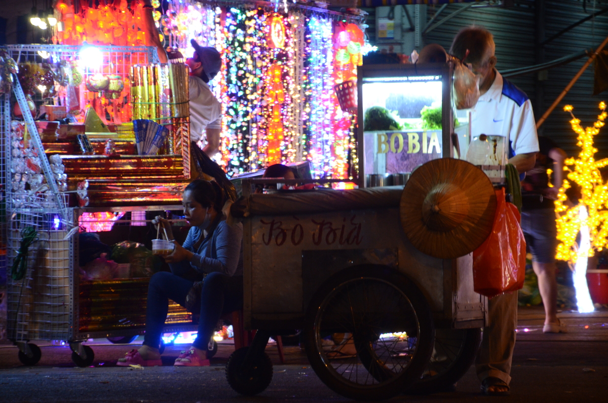 Street life — bò bía, thuốc lá, and Miếu Nổi.